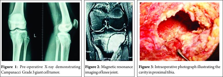 Case Report: A 15-year-old girl presented to us with the complaints of pain in the left knee of 3months’ duration and inability to squat. Radiographic imaging was done which showed lytic lesion involving the proximal tibia and showing cortical destruction. The lesion was graded as a Campanacci Grade 3 tumor. The patient was taken up for surgery and an extended curettage was performed, and the cavity was packed with bone cement. The patient was asymptomatic at the end of 18-month follow-up and was continuing her normal daily activities.