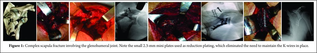Patient 1 – Scapula fracture: A 40-year-old male medical doctor presented with a complex multifragmentary scapula fracture involving the glenoid fossa and extending to the spine of the scapula after he felt down a horse. We preferred to approach this injury with the patient in prone position and the ipsilateral upper limb abducted at 90° on a radiolucent hand table. After exposure of the fracture fragments, we manipulated them directly using small Weber clamps, small-diameter Schanz pins, and K-wires to obtain reduction. We could have fixed the temporary reduction with smooth 1.5 mm K-wires; however, those wires often block access to sites where definitive plates are to be placed. Provisional fixation was performed using a locked 2.3 mm plate and screws. The mini-plate was contoured and applied in the best position to hold the reduced fracture. More than one plate was used in different locations to help off-load stresses while the reduction was maintained. Some K-wires were maintained until final fixation with the 3.5 mm plate(s). Final fixation was performed with a one-third tubular plate positioned at the inferior edge of the glenoid fossa and along the lateral border of the scapula (Fig. 1).