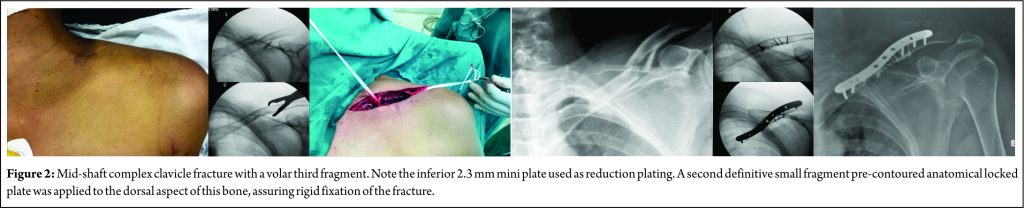 Patient 2 – Clavicle fracture: A 23-year-old male student presented with a mid-shaft clavicle fracture, with a large inferior third fragment. We felt it was important to achieve anatomical reduction of this small fragment. In this particular case, we preferred to approach the fracture with the patient in a beach chair position and the ipsilateral upper limb draped free. After a superior approach, we reduced the large third fragment with one of the main fragments, thus transforming the three-part fracture into two parts. We maintained the temporary reduction with one mini plate applied over the third fragment of the fracture. A second definitive small-fragment pre-contoured anatomical locked plate was applied to the dorsal aspect of this bone, guaranteeing rigid fixation of the fracture. Finally, the incision was closed in layers (Fig. 2).