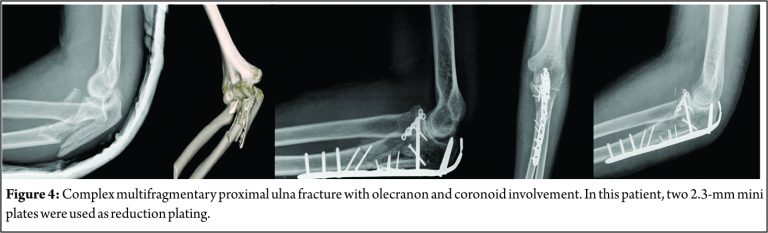 Patient 4 – Proximal ulna fracture: A 33-year-old female dentist presented with a complex multifragmentary proximal ulna fracture with olecranon and coronoid involvement after a motorcycle accident. We approached the injury with the patient in prone position, and the elbow flexed at 90°. The universal Campbell approach was used both to expose the fracture fragments and to reduce the dislocations (ulnohumeral or proximal radioulnar joint). Temporary fixation was achieved with smooth 1.5 mm K-wires; however, these were not sufficient to adequately hold the comminuted fragments in place. Thus, 2.3-mm plates and screws were applied to secure the reduced fracture. We used more than one plate in different places to secure the reduction. K-wires were removed after provisional plating fixation. Stable anatomic final fixation of the ulna was performed with a long small-profile locked contoured plate positioned at the dorsal aspect of this bone. The final plating overlapped the dorsally positioned mini plate (Fig. 4). Finally, ligamentous component of the injury was addressed and repaired by transosseous reinsertion.
