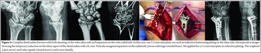 Patient 5 – Distal radius fracture: A 27-year-old female librarian presented with a complex articular distal radius fracture with a metaphyseal split on the volar ulnar side of the radius. She reported to fall down when she was skating. We decided to approach this injury with the patient in supine position and the upper limb on a radiolucent hand table. The Henry volar approach was used to expose the fracture fragments. We reduced the split fragment first and secured the temporary reduction with a smooth 1.2 mm K-wire passed from medial to lateral. We fixed the split fragment using a 2.3 mm plate and screws applied to the apex of the fracture to avoid shearing of this fragment. Final rigid plate fixation with a volar anatomic distal radius locked plate was performed (Fig. 5).