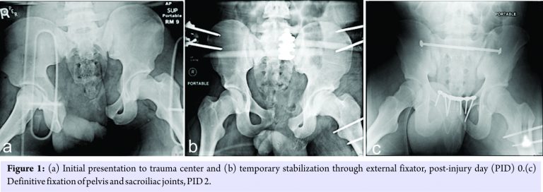 The authors obtained the patient’s informed written consent for print and electronic publication of this case report. An 18-year-old male collegiate bound football lineman was an unrestrained driver in a rollover motor vehicle accident with resulting prolonged extrication and a positive blood alcohol screen during the summer of 2012. He was intubated at the scene and taken to a Level-1 trauma center. The patient had no other past medical history. At presentation, he was found to have multiple fractures, including an open book pelvic fracture with complete disruption of the posterior sacroiliac complex resulting in both vertical and rotational instability of the left hemipelvis with associated pubic symphysis diastasis and left greater than right sacroiliac joint disruption (Fig. 1a).