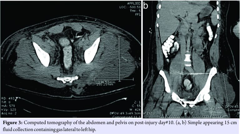His hypotension and tachycardia subsequently stabilized, and his hemodynamic instability began to respond appropriately to resuscitation. The pelvic fractures were temporarily stabilized post-embolization through an external fixator (Hoffman III type, Stryker, Michigan, Fig. 1b), along with the left femoral shaft fracture on post-injury day (PID) 0. The patient underwent definitive fixation of the pelvis and both sacroiliac joints through symphysis plating and sacroiliac screws (Fig.1c), respectively, as well as left tibia intramedullary nailing on PID 2. On PID 4, the patient underwent definitive fixation of the left femur through intramedullary nailing. The patient remained intubated post-operatively until PID 6 and was then transferred out of the Intensive Care Unit on PID 8 to a transitional care unit. The patient’s wounds were followed through out his hospital course. Incisions remained clean and dry throughout his hospital stay. He was intermittently febrile throughout his admission. Based on an increasing lymphocyte count on routine daily collection, a computed tomography (CT) of the pelvis on PID 10 was obtained showing evidence of a 15cm diameter simple-appearing fluid collection containing scant gas collection located lateral to the left hip (Fig. 3a and b) near the area of surgical fixation.