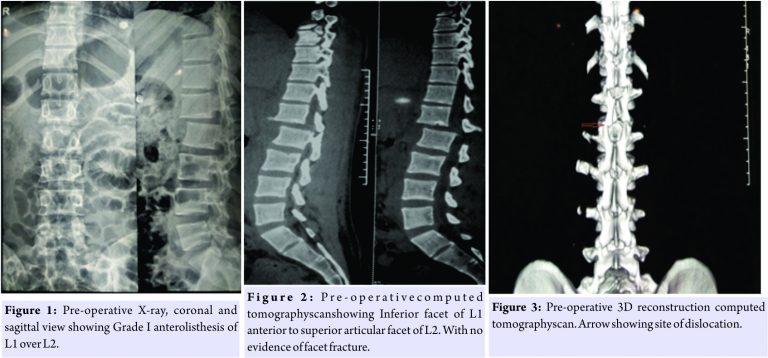 We present a case of a 22-year-old gentleman with traumatic L1-L2 dislocation without facet fracture. The patient presented to emergency department with alleged history of road traffic accident, when he sustained skid and fall from two wheeler 4 days back at a remote place in Andaman and Nicobar Islands, India. Immediately following trauma, the patient was not able to move his lower limbs and paralysis of his bowel bladder function for which he underwent catheterization in local hospital. Basic spine investigations were done in the form of X-rays and computed tomography (CT)scan, and the patient was immobilized on spine board while he was prepared to be referred to tertiary center. Subsequently, he was referred to our institution for definitive care.