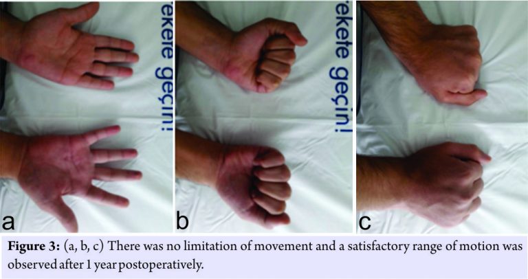 The patient was followed up with 2 daily clinic visits for 3 weeks at the intensive care unit. At the 4th week of the follow-up, the X-ray displayed a complete union in CMC fracture dislocation (Fig. 2a and b). For that reason, the splint was removed. A satisfactory range of motion (ROM) was observed at the time of the last follow-up. There was no limitation of movement, and full ROM was accomplished1 year postoperatively, DASH score was evaluated as 13.5 (Fig. 3a, b, c).