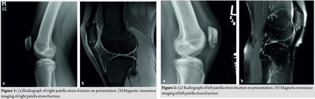 Conclusion: This case report illustrates how patella stress fractures may be successfully treated conservatively, even when presenting with a radiographic fracture line. This varies from other forms of stress fractures where surgical fixation is recommended once radiographic fracture line is noted. This is likely due to the abundant blood supply in the region, which allows for healing.