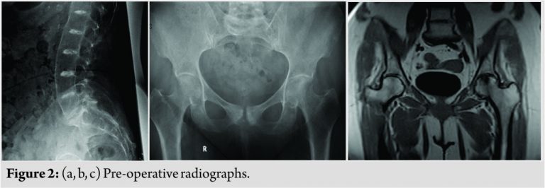 We report a rare case of a 69-year-old female who presented to us with chronic bilateral groin pain. She was unable to sit cross-legged, squat, or walk comfortably for long distances. The patient was previously diagnosed hypertensive and dyslipidemia. She had previous multiple episodes of polyarthropathy. There was no relevant family history. General physical examination revealed a bluish pigmentation of the sclera with blackish-brown pigmented spots and thickened ear lobules(Fig. 1a and b).