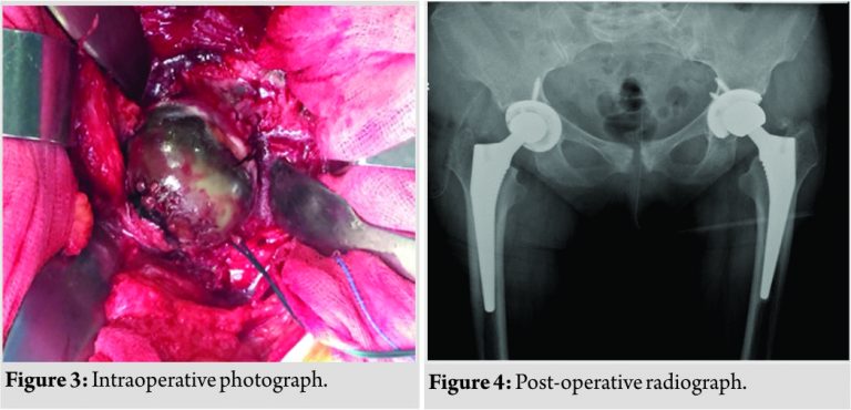 Special care was taken to remove as much of the capsule as possible to prevent local recurrence. The Corail Pinnacle poly on the metal implant with head size 32+1.5, stem size 11, and acetabulum cup size 50 was used for the left hip. The Corail Pinnacle poly on metal implant with head size 28+1.5, stem size 12, and acetabulum cup size 50 was used for the right hip. The post-operative period was uneventful (Fig. 4). The patient was made to ambulate within 3 days of surgery. The patient was initiated on a planned physiotherapy program. Our patient regained functional range of movements by the end of 3 months. The patient was independently ambulant and pain free with no complaints at the 1½-year follow-up.