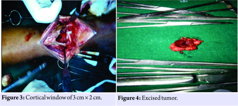 According to the radiological classification of campanacci the tumor was classified as a grade 3 lesions [1]. Laboratory investigations were within normal limits and surgery in the form of intralesional curettage with bone cement was planned. Anterior incision was taken over the distal end of the tibia. Bone was exposed, a cortical window of 3 cm × 2 cm was made (Fig. 3), the tumor was excised (Fig. 4), and curettage was done. The specimen was sent to histopathology for further examination. A thorough wash was given, and the defect was treated with 5% phenol. The cavity was filled with three layers consisting of bone graft, gel foam, and cement mixed with vancomycin, respectively (Fig. 5).