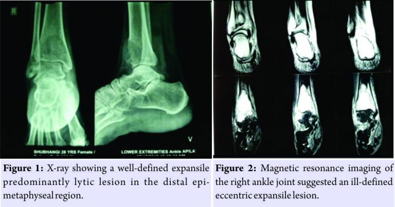 Case Report: A 28-year-old female presented with complaints of pain and restricted movement of the right ankle joint since 1 month. There was no history of trauma. On examination, tenderness on the anterior aspect of the right ankle joint with restricted range of motion was found. X-rays revealed a well-defined expansile predominantly lytic lesion in the distal epi-metaphyseal region of the right tibia with minimal periosteal reaction seen along the medial margin. Magnetic resonance imaging revealed an ill-defined expansile lesion involving the epi-metaphyseal end of the lower end of tibia causing cortical breach and having extra-osseous tissue component with the abnormal signal in flexor and extensor group of muscles with the possibility of GCT. Surgery by excision, curettage, and cementation was performed to fill the defect. Histopathology of the tissue showed multinucleated giant cells with a uniform vesicular nucleus and mononuclear cells which were spindle shaped with uniform vesicular nucleus suggestive of GCT.