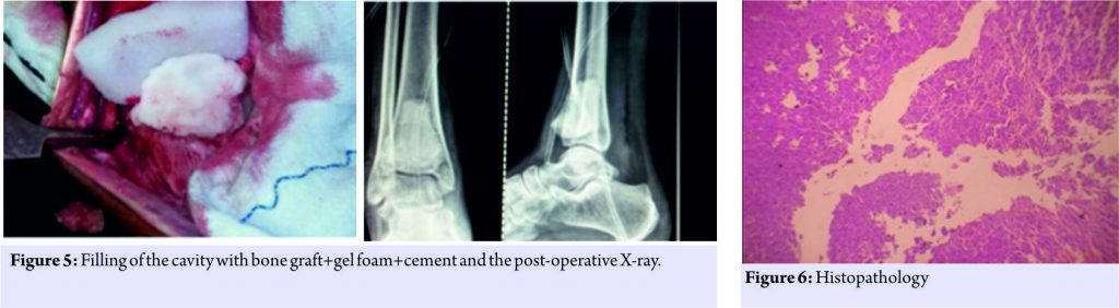 Hence, we conclude that a patient of GCT of distal tibia was successfully treated with intralesional excision+ curettage and bone cement with no signs of recurrence after 2 years.
