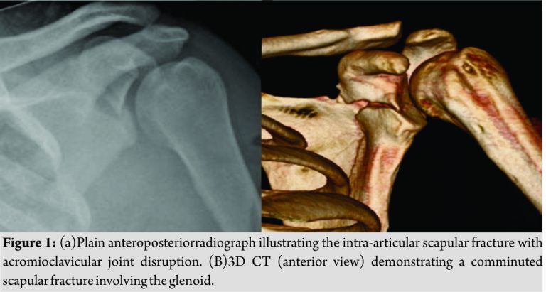 Neurovascular examination was unremarkable and no other injuries identified. Radiographs revealed anintra-articular fracture of the left scapula with disruption of the acromioclavicular joint (Fig. 1a). To help further assess the extent of injury, computed tomography with 3D reconstruction was performed which showed a comminuted fracture of the scapula involving the glenoid and body of the scapula (Fig. 1b). The patient underwent surgical fixation using a unique technique for repair of an intra-articular glenoid fracture with reduction of an associated acromioclavicular disruption.