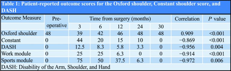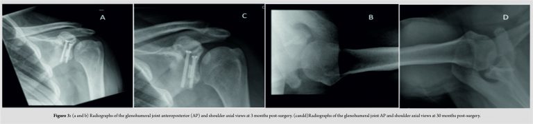 Follow-up of the patient at 3, 6, 12, 24, and 30 months was performed. Functional outcomes scores including constant score, Oxford shoulder, and disability of the arm, shoulder, and hand (DASH) were performed. Radiographs at 3 months and 30 months are shown in Fig. 3. Table 1 summarizes the functional scores over time, which has shown significant improvement during the post-operative period. In the case of negative correlations, this showed that reductions in the difference in DASH scores between shoulders occurred over time, indicating a return of normal function. Currently, the patients have returned to work as a manual shop assistant, plays rugby and cricket, with no pain, functional limitation, or restriction on activities of daily living.