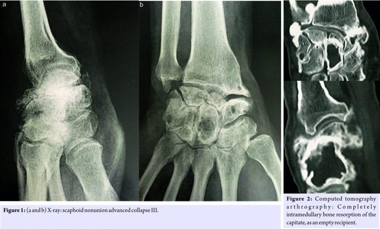 Proximal row carpectomy (PRC) is an accepted treatment for degenerative diseases of the wrist such as scaphoid nonunion advanced collapse (SNAC) [1]. When arthritis affects the midcarpal joint, PRC alone is contraindicated [2]. The replacement of the head of the capitate with the resurfacing capitate pyrocarbon implant (RCPI) (Tornier, Montbonnot Saint Martin, France) combined with PRC was first described by Goubier et al. [3]. Since 2011, few other studies showed that it is a treatment option for degenerative wrist diseases when the articular surfaces of the capitate and radius are damaged, while at the same time preserving wrist motion [4,5,6]. We report our experience in proximal PRC and RCPI with capitate bone graft for SNAC III wrist with completely intramedullary bone resorption of the capitate of a 55-year-old patient. We review the clinical evaluation, X-ray, computed tomography arthrography (CTA), and the surgical treatment.