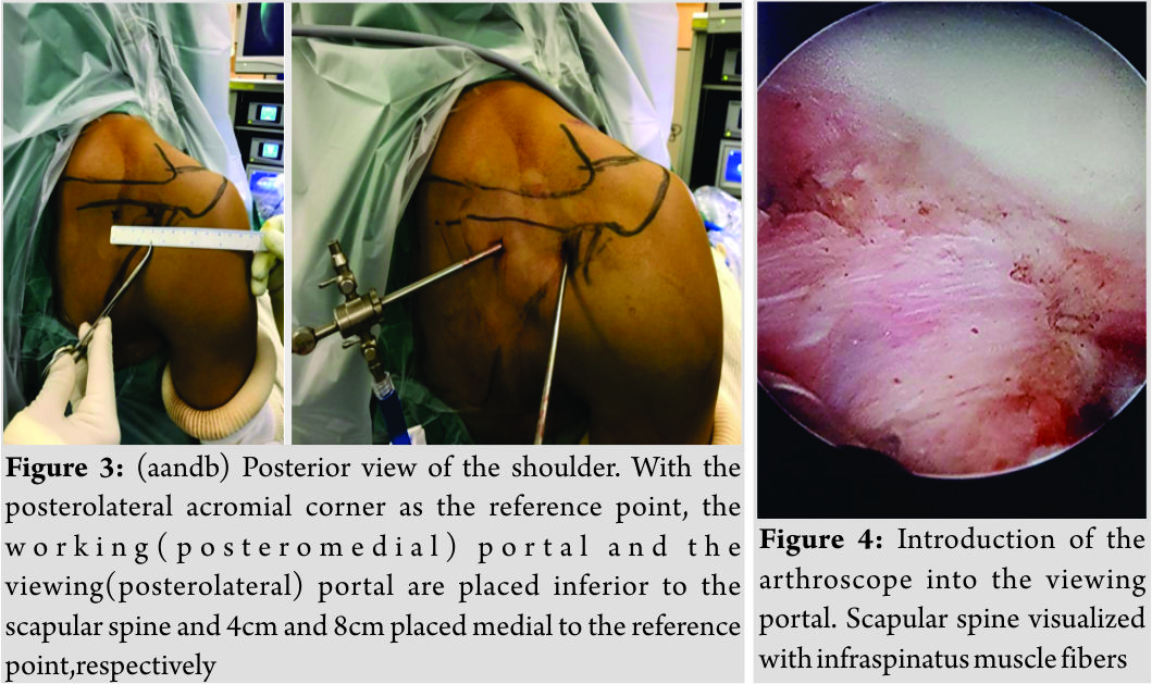 A detailed understanding of the anatomy of the spinoglenoid notch and the course of the suprascapular nerve is a key to achieve aadequate arthroscopic decompression. The spinoglenoid notch is found between 1.8cm and 2.1cm medial to the glenoid rim [4]. On coursing through the spinoglenoid notch, the suprascapular nerve goes on to give muscular branches to the infraspinatus muscle, thereby explaining isolated infraspinatus atrophy in patients with compression at the spinoglenoid notch. Overhead athletes, especially, those involved in repetitive overhead movements such as volleyball, baseball, and racquet sports and manual laborers who perform tasks above shoulders, are particularly susceptible to developing this condition. They often present with diffuse ache over the posterior shoulder region, associated with weakness on attempts at the external rotation. While they may not experience in a decrease in performance level, a thorough history would usually reveal posterior shoulder pain associated with classical infraspinatus atrophy on clinical examination. Atrophy may often be overlooked in these young well-developed individuals owing to the overlying trapezius and large deltoid bulk. Subtle decreases in the range of motion in external rotation may also be seen. Various techniques have been described for the successful decompression of the suprascapular nerve. Using open decompression technique, Postand Grinblat reported excellent and good results in 88% of the patients [5]. While technically challenging with a steep learning curve, arthroscopic decompression techniques have been shown to be safe and reproducible [6, 7]. Compared to conventional open methods, arthroscopic offers the following advantages: (1) Faster rehabilitation and return to sports, (2) better visualization of the anatomy, and (3) concomitant treatment of other shoulder pathology [6, 7, 8]. Plancher et al. described an arthroscopic technique utilizing the posterior portals [1]. The reported advantages of this technique include a clear visualization of the spinoglenoid anatomy with reduced periods to return to sports and daily activities. Good results were seen in their serieswith an average of 3-year follow-up. In the presence of compression by a cyst, it remains controversial whether cyst decompression alone is sufficient or cyst decompression in addition to a labral debridement/repair is necessary for treatment [6]. Good results have been shown by Lichtenberg et al. in their series of patients who underwent cyst excision in addition to labral repair [8]. Our modification of the arthroscopic technique described by Plancher et al. is achieved with the concurrent use of a blunt trocar for retraction in the same working portal as arthroscopic instruments used for decompression. This is an easily reproducible technique that provides good visualization of the anatomy, and adequate and safe decompression of the suprascapular nerve can be performed with good outcomes.