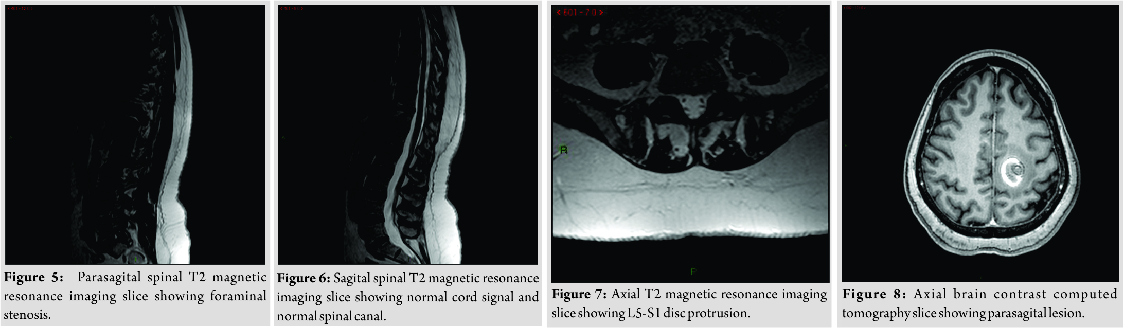 In regard to our patient, it was originally thought that the cause of the foot drop was lumbar in origin; therefore, we started our investigation with a new lumbar CT. The CT showed the known L5-S1 disc protrusion, located centrally and to the right with diffuse degenerative changes as well as sclerotic changes in facets and SIJ bilaterally (Fig. 1-4). There were no significant changes between the two scans. Since the CT findings did not explain the multi-root pathology noted on physical exam, a magnetic resonance imaging (MRI) with gadolinium injection was performed. The MRI demonstrated disc protrusions, severe right foraminal stenosis at the L5-S1 level and mild foraminal stenosis of the left side at the same level. No central spinal stenosis was observed, and the MRI signal suggested normal cord anatomy (Fig. 5-7). Since the imaging findings did not support a mechanical lumbar cause for the foot drop, an extra-skeletal cause was sought. A pelvic and hip CT scan ruled out any pelvic pathologies that could damage the peripheral nerves. A brain CT was ordered since the low back and pelvis were already ruled out as the source for the nerve damage pattern. The brain CT revealed a hemorrhage of 2.5cm in diameter with peripheral edema located in the left parietal lobe white matter (Fig. 8). MRI scan suggested an aggressive brain tumor. During the next few days, the symptoms worsened, and the patient lost her ability to move her right hand.