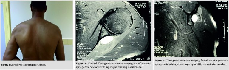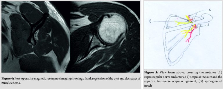 The suprascapular nerve originates from the brachial plexus (C4-C5-C6) and is essentially a motor nerve. It innervates the supra- and infra-spinatus muscles. It does not have a sensitive cutaneous territory. It is located about 2 cm from the capsule and passes through the supraspinatus fossa. Its path presents two critical points of passage(Fig. 5) [2]. A superior passage in the scapular incision which is closed at the top by the very solid superior transverse scapular ligament. An inferior and posterior passage at the spinoglenoid notch where it can be constrained by the inferior transverse scapular ligament. The muscular involvement may vary according to the seat of compression of the suprascapular nerve. The supraspinatus muscle is affected by compression at the level of its upper portion and that of the infraspinatus at its posterior portion. The causes of compression are multiple; the most common is a lesion of the labrum resulting in the formation of a cyst. The physiopathology is applicable toparameniscalcysts: The increase in intra-articular pressure drives the latter through the labral lesion, which forms a cyst. This pathology is rare with a ratio of 2–4% in the general population. However, it is often underestimated and diagnosed at a late stage [5,6]. In our case, only the infraspinatus muscle was concerned given the location of the cyst. The upper portion of the suprascapular nerve relevant to the supraspinatus muscle did not suffer from compression by the cyst. In consequence, there was no clinical sign of supraspinatus involvement, therefore, a negativeJobb test. Ductal syndromes of the suprascapular nerve are often seen at the stage of chronic neuropathy[1,2,5]. The patient consults for atypical pain suggestive of cervicobrachial neuralgia or rotator cuff syndrome. The initial pain is often diurnal and nocturnal, to become secondarily mechanical. Clinical examination will essentially check for a decrease in external rotation muscle strength, as well as amyotrophy of the supraspinatus fossa by palpation and amyotrophy of the infraspinatus fossa which can be clearly visible [2,3,4]. MRI and arthro-MRI are currently considered as the reference examinations for the positive, topographical, and etiological diagnosis of suprascapular nerve entrapment[7]. They allow the diagnosis as well as evaluation of muscular denervation. The most common radiologic signs are edema, atrophy, and fatty degeneration. Muscular pain is initially manifested by the presence of edema, which is a sensitive and specific sign of muscular denervation. It is a T2 diffuse hypersignal, homogeneous and concerns all the muscle. The topography corresponds to the territory of the motor branch intended for supra- or infra-spinatus. TheT2 hypersignal of the infraspinatus muscle was very visible on MRI sections in our patient (Fig. 2 and 3). Muscular atrophy and fatty degeneration become visible in chronic cases with a long evolution[5,8]. Arthro-MRI highlights its articular origin by seeking a lesion of the labrum. Computed tomography (CT) arthrography is often negative, and only the indirect sign of fat disappearing from the spinoglenoid indentation can suggest the diagnosis [7]. Nerve conductionstudies maybe helpful in confirming the diagnosis and have a greatprognostic value by giving information on the severity of the lesions. The non-operative treatment options are varied and include oral medications including nonsteroidal anti-inflammatory drugs as well as percutaneous needle aspiration associated with intralesional steroid injection. However, symptomatic paralabral cysts causing muscular atrophy that fails to respond to conservative treatment should be treated surgically. Several studies shown high prevalence of labral tears in connection with spinoglenoid cysts and have suggested a high recurrence rate if the intra-articular labral pathologic process is not addressed [1,5,6]. Schroder[6] objectified a recurrence rate close to 0% after labral repair. Hence, surgical treatment should not be limited to the resection of the cyst, but the labral lesion must be repaired to prevent recurrence[5,6,9,10].