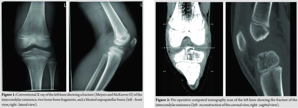Case Report: A male 8-year-old child presented with pain in his left knee and difficulties to walk after a combined injury of falling and contact trauma. Radiographic studies with conventional X-ray and computed tomography (CT) scan depicted a fracture of the intercondylar eminence. In this Type II fracture according to the classification of Meyers and McKeever, an operative treatment with knee arthroscopy was established to remove the loose bone. Post-operative, the knee was immobilized in extension for 4 weeks. Physiotherapy was initiated immediately after surgery. The follow-up CT scan 6weeks after injury showed a starting consolidation and the magnetic resonance imaging scan 8 weeks after injury a complete consolidation of the fracture.