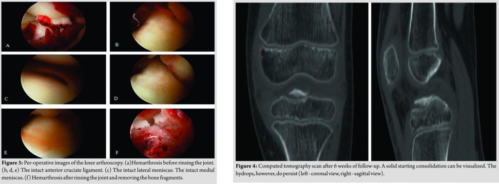 The fracture was classified as Meyers and McKeever Type II [4]. The initial treatment provided an adequate pain management with appropriate analgesics and plaster immobilization in 0–5° of flexion. Based on the clinical and radiological findings, a knee arthroscopy was performed 3daysafter injury. The indication for arthroscopic surgery was removal of the intra-articular bony fragments and to evaluate whether the fracture was stable. The fracture of the proximal tibia was visualized through arthroscopy (Fig. 3).