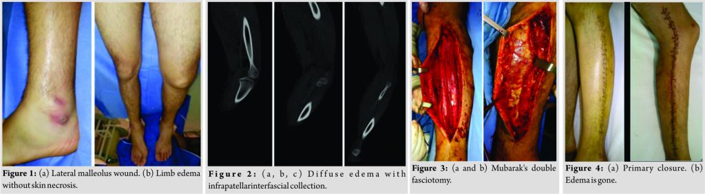 A 17-year-old male patient sustained a minor ankle trauma while skating. He was first admitted to a local health department. Initial findings were a 1 cm long wound in relation with his left lateral malleolus together with moderate swelling. No other sign or symptom was reported. Plain radiographs were performed with nopathological findings. About 6 hours later, the patient was admitted at our emergency room with disproportional limb pain, increased swelling, persistent fever, paleness, tachycardia, and hypotension (Fig. 1a and b). Blood tests showed anemia, leukocytosis, and elevated creatine phosphokinase (Table 1). The general condition of the patient got worse, with the need of mechanical ventilation and vasopressors due to the hemodynamic instability. Empiric antibiotic therapy was established with a triple scheme (ceftriaxone, vancomycin, and clindamycin). A computed tomography (CT) scan was done to find the presence of collections (Fig. 2a, b, c). The patient underwent his first surgical procedure which consisted of double fasciotomy of the leg, toexamine and release the tension of the four compartments involved (Fig. 3a and b). Mubarak and Owen [12] technique was used. Purulent material was obtained with no signs of necrosis. Drainage of the medial thigh compartment was performed at the same procedure. A vacuum-assisted closure device was used. Both leg incisions were primary closed (Fig. 4a and b). Multiple samples were forwarded to cultivation. Culture media demonstrated the presence of Streptococcus Pyogenes. The acute toxic-shock syndrome yielded immediately after fasciotomy. 24 hours later, the patient did no longer need mechanical ventilation and blood tests showed almost normal results. The patient underwent two more surgical procedures with the purpose of vacuum-assisted closure management and thigh wound healing. 1 week later, the patient was discharged from our institution. After 3 years of follow-up, the patient has fully recovered, with a functional limb with no restrictions.