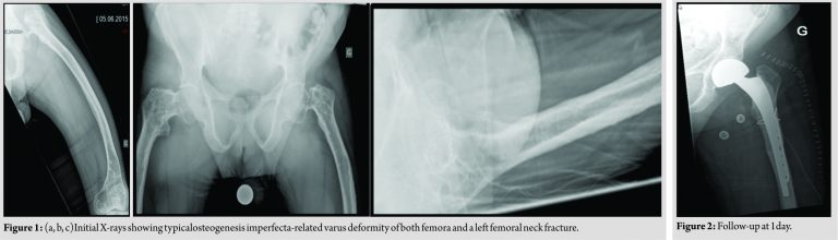 Conclusion: The incidence of OI is 1 in 10,000–20,000 births. People suffering from OI are known to be at more risk of fractures. Due to the bone deformity and weakness, treatment of fractures in patients with OI is a big challenge for orthopedic surgeons. Combined osteotomy and hemiarthroplasty is a reliable technique to treat a femoral neck fracture in a patient with typical OI-related varus deformity of the femora.