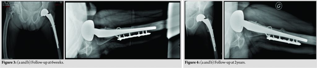 Apart from the fracture, X-rays showed thin cortices and heterogeneous bone density (Fig. 1a, b, c). We perform a hemiarthroplasty of the left hip with a bipolar cup and a straight, cemented stem (BIBOP cup size 44, stem ARCAD L, size B, both Symbios Orthopédie, Yverdon-les-Bains, Switzerland), combined with a valgus and shortening osteotomy of the left proximal femoral shaft (Fig.2, 3a and b). The patient started physical therapy with active assisted mobilization of his left hip and knee and strengthening of his gluteal and quadriceps muscles on day 1. He was also allowed full weight bearing and was rapidly able to switch from bed to his wheelchair and back by himself. He was discharged from hospital on day 9. At 2 years follow-up, the patient reported no pain, and his ability to mobilize himself was back to the pretrauma state, while the site of osteotomy showed signs of bony healing on X-ray (Fig. 4a and b).