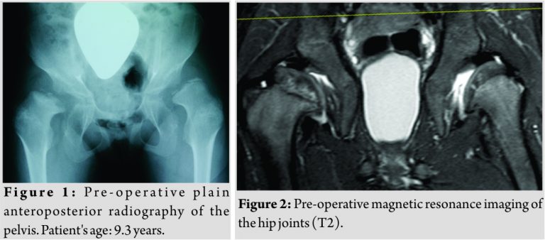This revealed flattened and nearly unossified femoral epiphyses. The neck of both femora was short and severe lateralization was seen with interruption of the Menard-Shenton line. The migration index according to Reimers[5] was 67% on the left side and 59% on the right side. The center-edge angle (CEA) of Wiberg [6]was −33° on the left side and −28° on the right side. MRI confirmed the subluxation of the hip joints. The cartilaginous and labral roof were completely deformed and proximally displaced. Intraarticular effusion was present in both hip joints (Fig. 2). Temporary epiphyseodesis (8plates) of the medial distal femur and medial proximal tibia on both sides was carried out to correct the severe valgus deformity. For a better understanding of the hip dysplasia, an arthrography was performed during the same anesthesia. Dynamic testing of the hips revealed incongruency in abduction on both sides. Hinge abduction with medial pooling and displacement of the labrum was obvious. In 20° of adduction, the femoral head and the acetabulum were congruent without any medial pooling (Fig. 3). In adduction, the labrum was horizontal without displacement. However, the bony roof of the acetabulum was too short in relation to the size of the femoral head. The center collum diaphyseal angle was reduced to 115° on both sides. To restore, joint congruency and coverage a valgization of the proximal femur of 20° in combination with a shelf acetabuloplasty were performed (Fig. 4). Post-operative immobilization was done with a spica cast in 20° abduction for 6 weeks followed by an in-house rehabilitation for 4 weeks. Due to a persistent flexion contracture of the right knee, which progressed during further growth, an anterior epiphyseodesis of the distal femur was performed at the age of 10.8 years. A year later (age: 11.9 years), the hardware was removed. At 12.0 years of age, enzyme replacement therapy (ERT) was initiated. At the last follow-up (age: 15.6 years), the patient weighed 35 kg and was 141 cm tall. Walking abilities were still limited – however, she was able to ambulate without crutches for small distances. The range of motion was still symmetrically reduced with EXT/FLEX 0°/0°/120°; IR/ER 40°/0°/30°; and ABD/ADD 30°/0°/20°. The supine anteroposterior pelvic radiograph revealed stable hips with a CEA of 19° on the left side and 33° on the right side. The migration index of Reimers improved to 25% on the left side and 23% on the right side (Fig. 5).