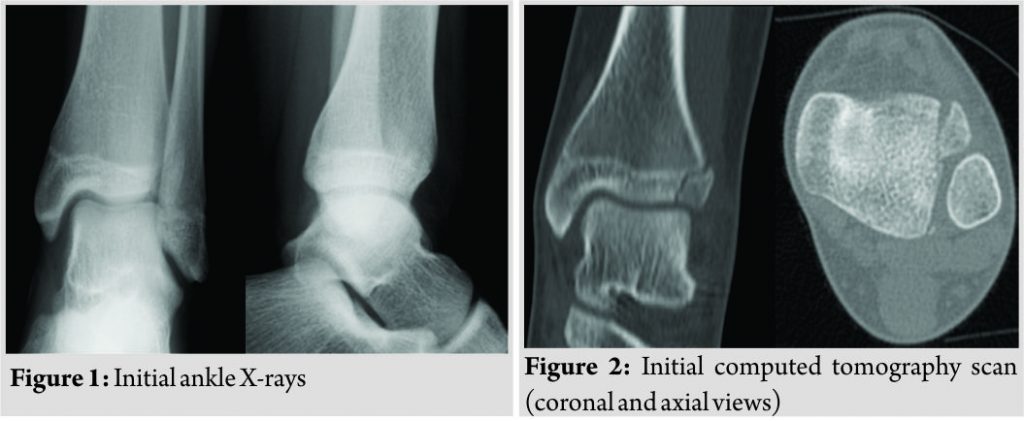 A 13-year-old female competitive basketball player sustained a forced external rotation type of injury to her left ankle while training. The injury was initially diagnosed as a mild ankle sprain by her clubs physician who recommended 2weeks non weight-bearing, followed by a period of progressive return to sports. No imaging studies were performed at that time. Due to persistent moderate ankle pain and inability to perform, the patient was referred to our orthopedic department 2months after the initial injury. She had mild swelling over her ankle and well-localized pain on palpation of the anterolateral portion of her ankle. Weight-bearing was painful but the range of motion was normal, and there were no palpable bony deformity, bruising, or neurovascular compromise. Plain radiographs showed an irregular lucency on her lateral distal tibial epiphysis (Fig. 1) that was further evaluated with a computed tomography (CT) scan – the coronal and axial images showed a small, Salter-Harris Type III fracture of the anterolateral portion of the distal tibial epiphysis (Fig. 2),