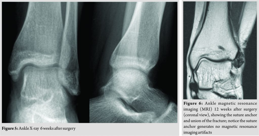 Conclusion: The Tillaux fracture pattern requires a high level of clinical suspicion and careful evaluation since it can be misdiagnosed as a simple ankle sprain in adolescents and progress to persistent ankle pain without appropriate treatment. Our surgical technique of suture anchor fixation avoids the risk of fragmentation of the fracture fragment and was able to provide an excellent clinical result.