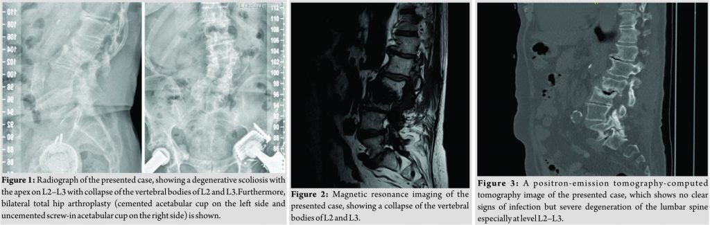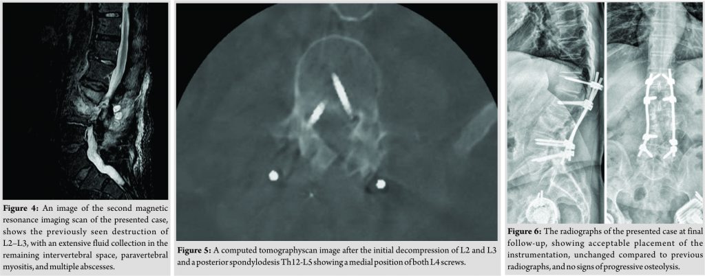 A 78-year-old male patient was referred to our tertiary, university hospital outpatient clinic with pain in his right leg. His medical history included a laminectomy of L3-L5, performed 1.5 years before his current visit, because of spinal stenosis as a result of degenerative scoliosis. This procedure was followed by the collapse of the vertebral bodies of L2 and L3 with compression of the right nerve root and spinal stenosis at L3. There had not been any wound problems or other complications after the first procedure. Further medical history included bilateral total hip arthroplasty, revision of the left hip arthroplasty after 19 years, left total knee arthroplasty, hypertension, and ulcerative colitis (without medication). The physical examination showed a lumbar scoliosis with a painful and slightly reduced range of motion of the spine whereas the sacroiliac and hip joints showed a pain-free and normal range of motions. The knee and Achilles tendon reflexes were lower on the right side. Sensation and motor function were normal. The radiographs (Fig. 1) and magnetic resonance imaging (MRI)(Fig. 2) showed degenerative scoliosis with the apex on L2-L3 with the collapse of the vertebral bodies of L2 and L3. Serum markers for infection, 2 months before the presentation at our clinic, were as follows: C-reactive protein (CRP) <1 mg/L, leukocytes 8.8 × 10 e9/L, and erythrocyte sedimentation rate (ESR) 12 mm/h. To exclude a possible spondylodiscitis, as a cause of the sudden vertebral body collapse a positron-emission tomography-computed tomography scan was performed, which showed no clear signs of infection but severe degeneration at level L2-L3 (Fig. 3). We planned a surgical decompression of L2-L3 on the right side with a posterior spondylodesis of L1-L5. During the ambulatory waiting time before surgery, the patient’s symptoms worsened. He was unable to walk and stand because of severe pain in the lumbar spine, without signs of neurological impairment. Four weeks before the onset of progressive symptoms, a broken molar was removed during a dental procedure. The patient interview revealed no alternative explanation for his worsening condition. He was admitted to the hospital, and the date of surgery was advanced. Serum infection markers showed a CRP of 174 mg/L, leukocytes of 11.9x10e9/L, and ESR of 128 mm/h. A new MRI scan showed the previously seen destruction of L2-L3, with an extensive fluid collection in the remaining intervertebral space, paravertebral myositis, and multiple abscesses (Fig. 4). Based on the new clinical situation, a decompression of L2 and L3 and a posterior spondylodesis T12-L5 was performed obtaining deep cultures of tissue and the abscess in the disc space. Vancomycin and ciprofloxacin were started postoperatively. Weakness of the right quadriceps was observed in the first postoperative hours, and a CT-scan (Fig. 5) showed a medial position of both L4 screws. These were replaced by using a revision procedure in the same day. Unfortunately, the weakness persisted in the following weeks. All intraoperative cultures showed P. micra, and the antibiotic treatment was changed to penicillin intravenously (12 g daily) based on the sensitivity spectrum. The pain and infectious signs subsided, and the serum infection markers improved after 2 weeks of antibiotics as follows: CRP 43 mg/L and leukocytes 9.3 × 10 e9/L. The antibiotic treatment was continued orally with clindamycin (600 mg three times daily) for 4weeks. At the last visit to the outpatient clinic, at 1year after surgery, the patient reported only occasional back pain. Blood results as follows: CRP 8 mg/L, leukocytes 8.6 × 10e9/L, and ESR 32 mm/h. Radiography of the spine (Fig. 6) showed unchanged spinal instrumentation and no signs of spondylodiscitis relapse.