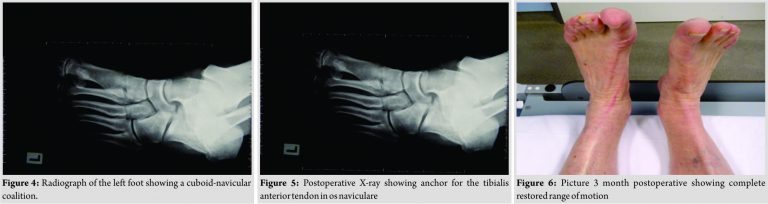 The tibialis anterior tendon (TAT) rupture was first described by Brüning, in 1905 [1]. Tibialis anterior (TA) tendon rupture is a relatively rare injury that has been documented primarily in case reports and small case series [2]. About 80% of the TAT ruptures are spontaneous and 20% are traumatic [3]. The closed TAT rupture mostly occurs in male patients between 60 and 70 years. The main cause is degeneration of the tendon through repeating microtrauma at the retinaculum inferior, steroids, inflammatory arthritis, goat, diabetes, infection, ischemia, or hyperparathyroidism [4]. A tarsal coalition is a connection between tarsal bones. The incidence is ~1% and the appearance of a bilateral coalition is believed to be 50% or more [5]. The most commonly seen coalitions in the foot are talocalcanar and calcaneonavicular (≥90%). The cuboid-navicular coalition (CNC) is the least reported one. Besides the congenital coalition, an acquired coalition is discussed (trauma, infection, arthritis, and tumor), but this is much more uncommon [6]. The abnormal articulation between the bones can lead to deformation of the foot with degeneration, stiffness, and pain. Asymptomatic coalitions in the adult can become symptomatic after a trauma [7]. Microfractures and bone remodeling of the coalitions have been identified to be one cause of pain activator [8].