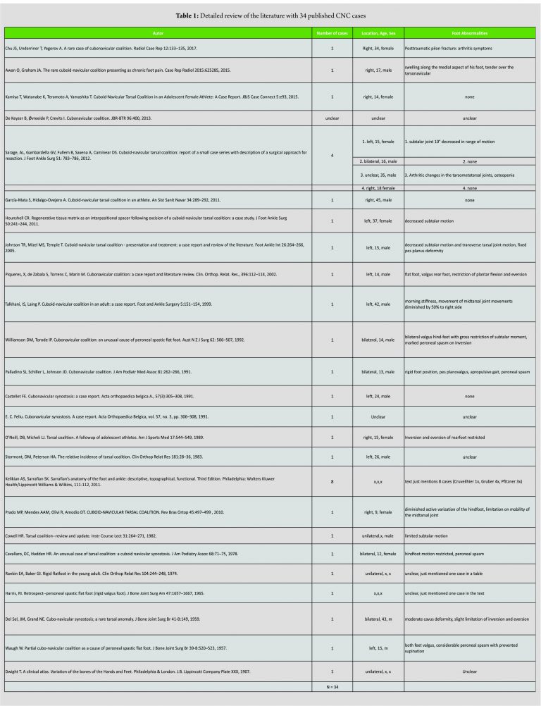 A detailed review of the literature showed only 34 published CNC cases (Table 1). The diagnosis of coalition is usually made by plain radiographs. The 45° medial oblique view is the best view to show a CNC [5]. Looking at the literature, 1/3 of patients coming with a painful coalition have a foot abnormality. Most frequently valgus deformity reduced mobility in the subtalar joint and peroneal spasm is found [12]. Waugh described a case with a peroneal spasm in a boy with a CNC and recommended to look carefully for coalitions in patients of a spastic flat foot [13]. Because the CNC preserves the Chopart and Lisfranc joint, chronic pain symptoms are much more uncommon then in other types of coalitions [14]. The treatment of a symptomatic CNC should start with a conservative therapy including rest, anti-inflammatory medication, and orthotic device. If no pain relief is noticed, surgery can be considered as follows: