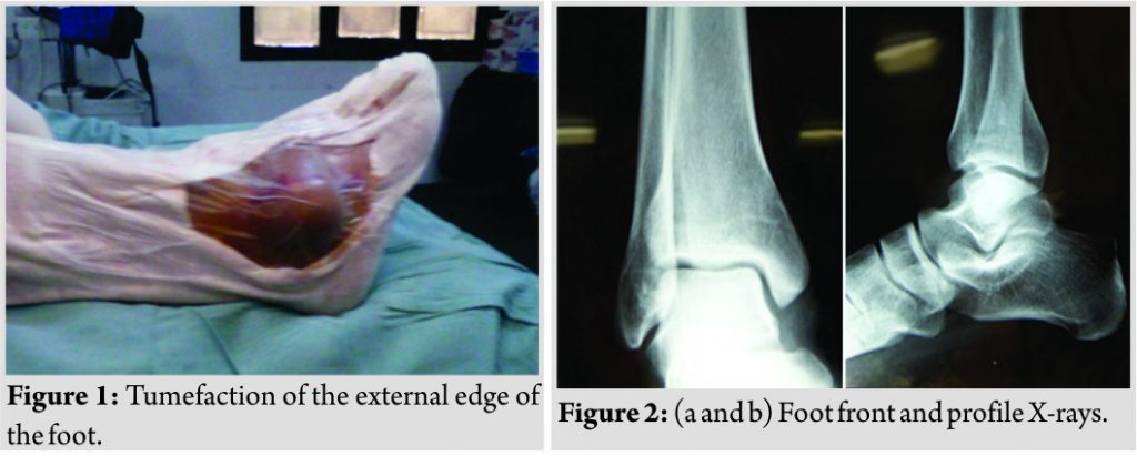 Patient G.J, 60 years old with no particular pathological history, was hospitalized for exploration of a swelling of the external border of her right foot that had been evolving for 2 years. The physical examination showed an oval swelling of 3 cm long, lying in the submalleolar external region, painless, mobile, and of firm consistency (Fig. 1). The biological assessment did not show any inflammatory syndrome. Standard radiography was normal (Fig. 2).