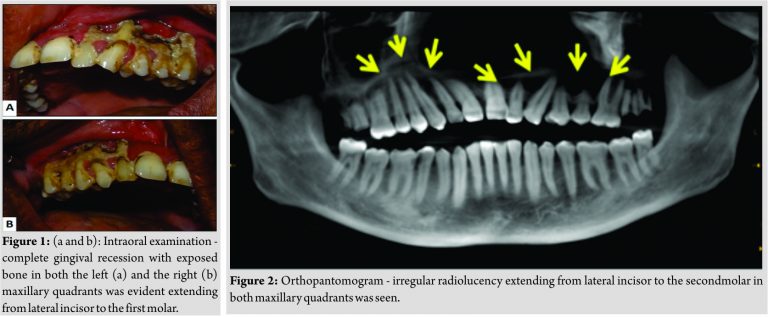 A 46-year-old male patient reported with complaint of pain in upper jaw region for1 year. There was a history of dengue fever with resulting leukopenia and thrombocytopenia 14-month back. The patient was positive for NS1 antibodies which are diagnostic for dengue infection [2]. 2-month after episode of dengue fever patient experienced swelling of gums followed by recession exposing underlying bone. There was no history of prolonged medication, drug allergy, and any dental treatment. On clinical examination, intraorally (Fig. 1a and b), there was complete gingival recession with irregular exposure of alveolar bone and a part of basal bone in both the left and the right maxillary quadrants extending from lateral incisors to the first molar. Root pieces of 27, 28, and 17 were evident. The patient’s oral hygiene was poor. Orthopantomogram revealed irregular radiolucency involving alveolar bone and basal bone in both maxillary quadrants in the region of lateral incisor and the second molar (Fig. 2).