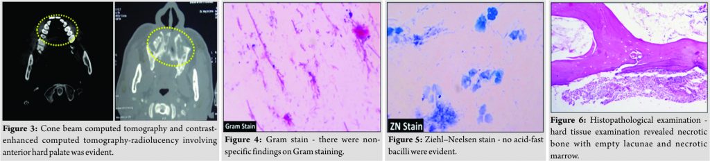 Cone beam computed tomography and contrast-enhanced computed tomography(Fig. 3) showed bone destruction in the region of anterior hard palate. Provisional diagnosis of ONJ was given. Further, investigations were performed to rule out possible etiologic agents. There were non-specific findings on culture and Gram staining (Fig. 4).