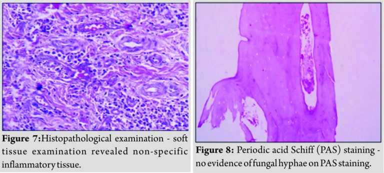 No acid-fast bacilli were evident on Ziehl–Neel senstaining (Fig. 5). On incisional biopsy, necrotic bone and marrow tissue were evident along with focus of inflammatory cells in hard tissue bit (Fig. 6), whereas soft tissue bit (Fig. 7) exhibited plump endothelial cells and blood vessel occlusion. Periodic acid Schiff (PAS) staining (Fig. 8) was performed to rule out fungal infections. Blood glucose, renal function tests, liver function tests, and HIV screening test were normal and ruled out the presence of any underlying systemic condition. The diagnosis of ONJ was continued, but no etiology could be attributed.