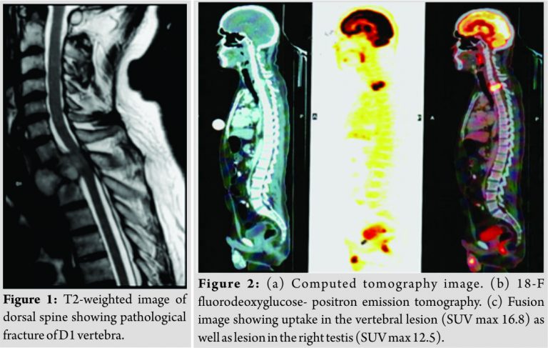 43 years’ male presented with paresthesia and paraparesis for 5 months. The patient had Grade 5 power in bilateral upper limbs, Grade 0 power in bilateral hip and knee, and Grade 3 power in the ankle and toes, with hyperreflexia in deep tendon reflexes with ankle clonus bilaterally. The patient did not have any sensory deficit or bladder bowel involvement. Magnetic resonance imaging (MRI)of the dorsolumbar spine revealedpathologicfractureinvolvingD1vertebra(Fig. 1). Computed tomography (CT)-guided biopsy revealed a highly vascular tumor with cells arranged in nests formed by vascular channels(immunohistochemistry [IHC]: synaptophysin and S100: strongly positive), suggestive of a paraganglioma. Plasma-free normetanephrine was normal (156 pg/ml [0–196]). For the localization of primary tumor 18-F fluorodeoxy glucose- positron emission tomography-CT scan was done which revealed the primary lesion in the right testis(Fig. 2).