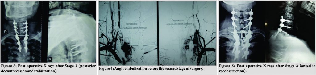 He underwent right orchidectomy and histopathology report was suggestive of paraganglioma (IHC: synaptophysin, S100, and chromogranin: positive). Surgical approach was planned as a staged procedure. In the first stage under general anesthesia, in prone position, midline posterior incision was taken. Decompression with fixation from C4 to D4 vertebra was done with lateral mass screws in the cervical spine and pedicle screws in the dorsal spine(Fig. 3). The patient underwent angioembolization before the second stage in view of high vascularity to reduce the intraoperative blood loss(Fig. 4). For the second stage, with the patient under general anesthesia in supine position, vertical incision was taken. Sternohyoid and sternothyroid were incised. Plane was created in between the vascular and the visceral axis. Tumor at T1 was excised, bleeding was controlled, and the spinal cord was decompressed. Tricortical strut graft was harvested from the left anterior iliac crest. Bed was prepared and the graft was inserted. Anterior plating was done(Fig. 5). Tricortical bone graft was used for the reconstruction of the anterior column along with anterior cervical plate. Studies have shown no deleterious effect of post-operative radiotherapy of upto 48 Gy on graft uptake. Postoperatively, the patient under went conventional external beam radiation therapy in 25 fractions at a median dose of 45 Gy (range, 41.4–68 Gy) 4 weeks following the surgery to avoid wound-related complications. The patient was immobilized for 3 weeks in bed following which he was mobilized with a Philadelphia brace and a walker. The patient recovered neurology fully following the second stage of surgery and is at present asymptomatic 2 years following the surgery.