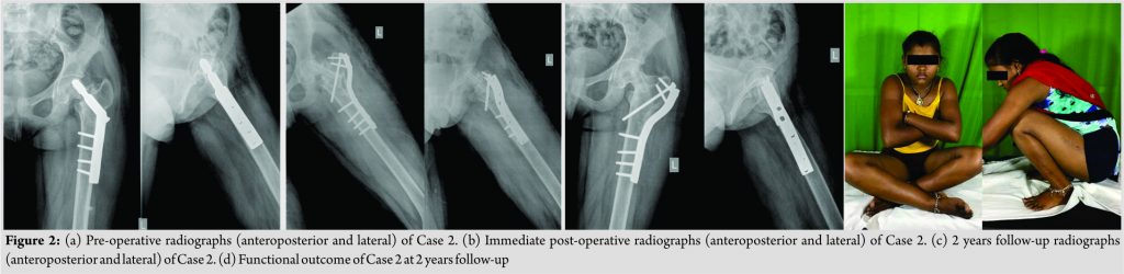 A 13-year-old girl presented with inability to weight bear on the left lower limb. 10 months back she had sustained fracture around the left hip following trivial fall and was confined to bed. 4 months after this fall, she underwent surgery of left hip (it could be verified from patient records that she had pathological fracture neck of femur secondary to the unicameral bone cyst and was treated by open reduction, subtrochanteric valgus osteotomy, and fixation with sliding hip screw). Following surgery, she continued non-weight bearing ambulation with crutches as any attempt to bear weight resulted in pain. Examination revealed the following ROM of the left hip: Flexion – 110°, extension – 5°, abduction – 30°, adduction – 20°, and internal and external rotations – 10° each. There was true supratrochanteric shortening by 2 cm. Radiographs revealed ununited transcervical fracture neck of the femur with sliding hip screw in situ and evidence of healed subtrochanteric osteotomy. There was no evidence of any focal bone pathology. Treatment given: Both cases were operated in the fracture table under general anesthesia. Hip joint was accessed through Watson Jones approach. All implants were removed. Cancellous bone graft harvested from ipsilateral iliac crest interposed at the pseudarthrosis site after freshening. Non-vascular fibular strut graft of appropriate length inserted through the sliding screw tract across the fracture site. Lateral based (1.5 cm) subtrochanteric wedge removed to valgise the femoral neck to a desirable extent (aimed at increasing the neck-shaft angle by 15°). Both the osteotomy and fracture fixed with contoured 4.5 narrow dynamic compression plate and screws. In Case 1, a cancellous screw could be passed into the neck across the pseudarthrosis. It was not possible in Case 2 as the neck was very narrow. Case 2 had an interfragmentary screw across the osteotomy site. Histopathological examination of the bone wedge removed revealed evidence of fibrous dysplasia in Case 1 and did not show any pathology in Case 2. Presumably, the cyst had healed though previous radiographs showing the cyst was not available. ROM exercises were started in the immediate post-operative period for both cases. They were made to walk non-weight bearing with axillary crutches for a period of 2 months after which they progressed to partial weight bearing as tolerated. Once evidence of full union was noted on the radiographs, they were progressively made to weight bear fully, and crutches were discarded. The fracture united uneventfully in both cases. The results and follow-up characteristics are summarized in Table 1 (Fig. 1 and 2).