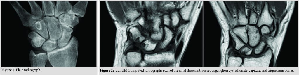 There are multiple causes of wrist pain. The most common causes include arthritis and post-traumatic conditions such as scapholunate advanced collapse and scaphoid nonunion advanced collapse. Infection has to be ruled out in all patients with previous surgery[5].IGC or in other terms synovial bone cyst, juxta-articular bone cyst, ganglionic cystic defect of bone, and subchondral bone cyst, is a very rare cause of wrist pain. Fisk was the first to describe IGC [6] in 1949 as a periosteal ganglion-like lesion developing a cystic bony defect through intraosseous penetration. Followed by Crabbe[7] in 1966 who named it the IGC. Pathogenesis of IGC still remains controversial. Differential diagnosis of painful cystic lesions of the carpus will include osteoid osteoma, giant cell tumor, enchondroma, intraosseous ganglion, osteoblastoma, and Kienbock’s disease[5,6]. In osteoid, osteoma pain is more significant and normally responds very well to NSAIDs. Enchondroma or intraosseous chondroma is normally asymptomatic and almost exclusively located in the scaphoid[5]. The radiographic appearances in the other tumors are very different from that of IGC. In the majority of published series, IGC has been reported in lower limbs, and mainly occur in the epiphysometaphyseal part of the femur and tibia[7]. IGC can be a painless incidental finding or painful and in effectively treated with analgesic medications[8]. The pain in IGC is believed to be due to increased intraosseous pressure secondary to pathological process development within an inextensible limited cavity [7]. Furthermore, patients might have swelling if the cyst ruptures or increasing pain if develop pathological fractures [9,10,11]. Diagnosis is normally confirmed by clinical picture supported by computed tomography, MRI or histopathology in some cases. Management depends on the patient’s clinical symptoms and the imaging findings. When they are asymptomatic lesions, the management can be regular clinical and radiographic evaluation to identify progression (increase in the size of the IGC and/or cortical erosion) which might require surgical intervention [7]. On the other hand, symptomatic IGCs, might not respond to painkillers and then surgery would be indicated [12].Surgery will involve curettage of the cyst followed by an autologous bone grafting with the intention to avoid any recurrence or collapse. A vascularized bone graft is advisable when treating bone cysts associated with fracture [13].In our case, the patient responded well to conservative measures did not require surgery, however, still under follow-up.Osagie et al.[14] reported a 17-year-old male with a 12-month history of progressive right wrist pain due to an intraosseous ganglion of the trapezoid and capitate. The lesions were found to be continuous with the wrist synovium. Due to the size of the defect following the curettage, bone graft was harvested from the ipsilateral iliac rest and cancellous bone used to pack the cavity [14].