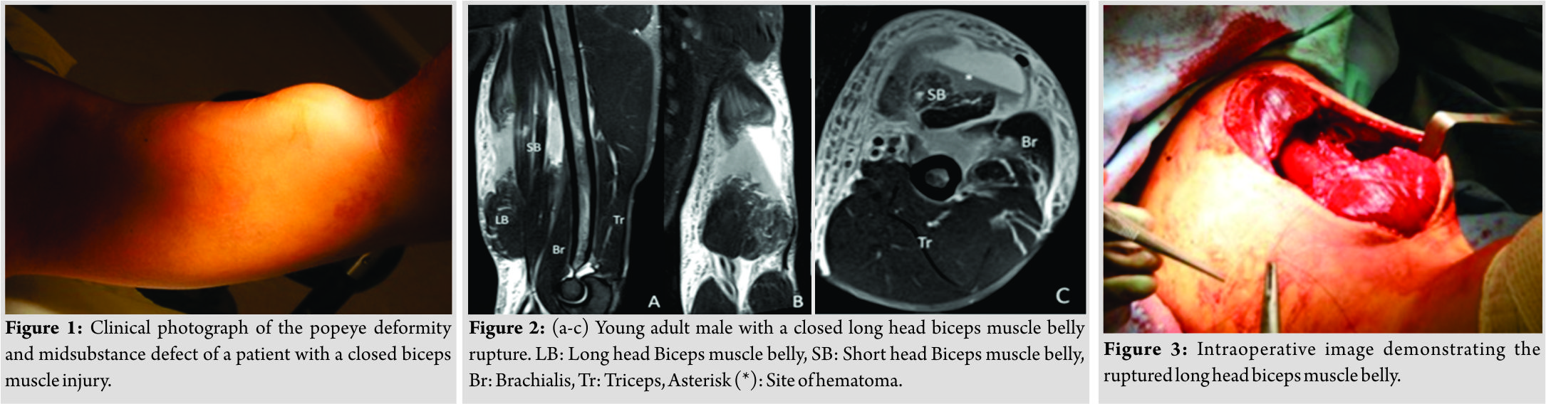 Closed traumatic ruptures of the biceps brachii muscle belly are rare injuries, despite the intra-muscular nature of the tear they can be successfully treated with appropriate operative timing and technique.