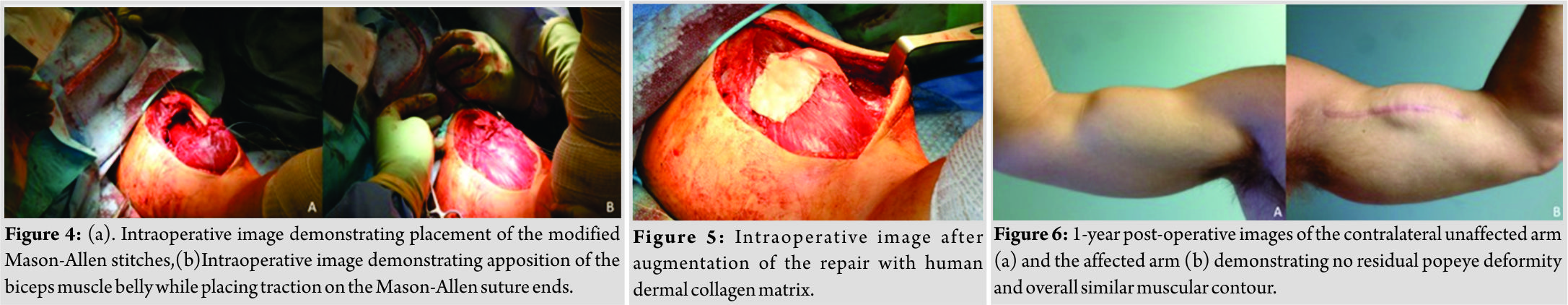 Case Report: We report a case of a traumatic long head of the biceps brachii muscle belly rupture repaired primarily through the Kragh technique augmented with human dermal collagen matrix. The patient demonstrated full strength, an intact repair through clinical exam and magnetic resonance imaging at 6-year follow-up. Dash scoring demonstrated 0 (no disability) out of 100 at this time.