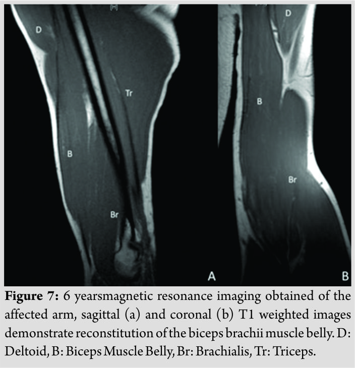 The elbow was subsequently taken through a range of flexion, extension, pronation, and supination with no blocks to motion or repair site gapping. Subsequently, fascial and skin closure was performed, and a posterior mold splint was placed in 90° of flexion. The patient’s post-operative rehabilitation protocol consisted of a 6 weeks period of progressive splinting from 90° of flexion to full extension. He was allowed to begin active pronation and supination in the splint at 3 weeks. From 6 to 12 weeks, the patient remained in a hinged elbow brace with an allowable arc of motion from 30 to 90° of flexion. He progressed 10°per week until full extension and flexion were achieved. From 3 months to 1 year the patient began a slow progressive strengthening program. The patient notably had achieved 5/5 flexion and 5/5 supination strength and retained full range of motion at his 1year follow-up appointment. A small divot was noted at the repair site but was acceptable cosmetically to the patient and similar to the contralateral arm (Fig. 6). The patient subsequently presented to clinic 6 years following the initial injury for evaluation of a palpable suture over the proximal end of the incision. On physical examination, he had retained full range of motion and had 5/5 strength with elbow flexion and supination. A disability of arm, shoulder, and hand (DASH) score was obtained at this time and was rated a 0 (no disability) out of 100. In addition, a score of 0 (no difficulty) was reported for the work and sport modules. A follow-up MRI at this time demonstrated reconstitution of the biceps brachii muscle belly with minimal residual intrasubstance scarring (Fig. 7).