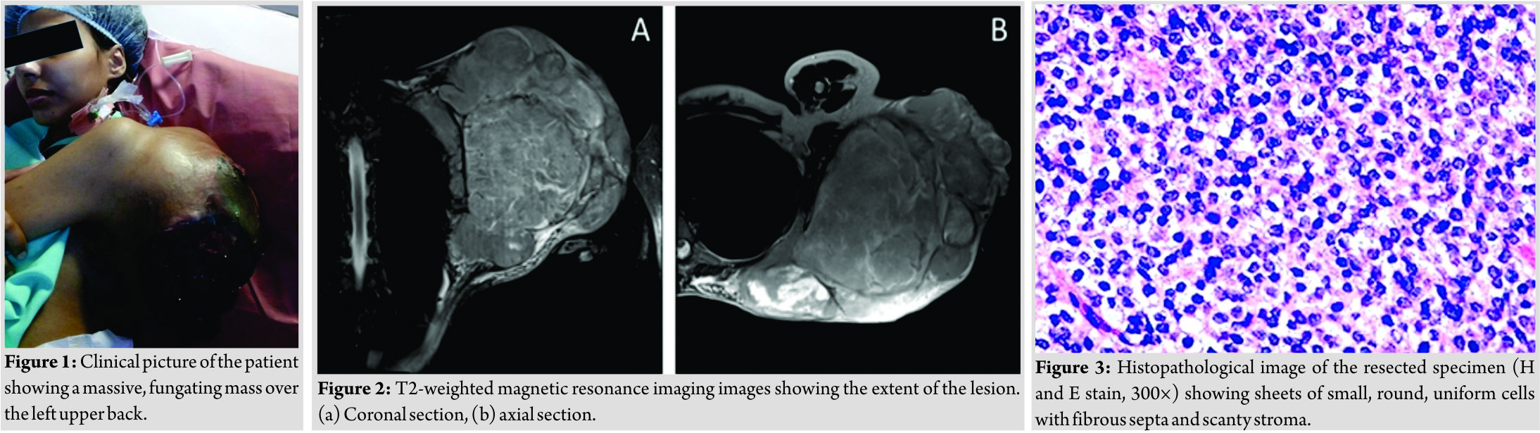 The patient was febrile and unable to use the left upper limb due to the size of the lesion and excruciating pain. Magnetic resonance imaging of the shoulder and upper back showed a T1 isointense and T2 heterogeneous high-signal intensity lesion which measured 18 cm ×27cm × 26cmin size, with multiple fluid levels, degenerative cystic changes, hemorrhage, areas of necrosis, and infiltration of periscapular musculature (Fig. 2). On computed tomography (CT) scan, tumor was ill defined with heterogeneous attenuation, multiple areas of cystic changes, and gross osteolysis of the scapula. However, the shoulder joint, chest wall,and the brachial plexus were not involved, axillary vascular bundle was displaced anteriorly without signs of infiltration. Whole body positron emission tomography-CT scan showed no signs of pulmonary or distant metastasis. Diagnosis of Ewing’s sarcoma was made by histopathological examination of needle biopsy sample from the swelling, which showed sheets of small, round, and uniform cells with scanty cytoplasm, separated by fibrous strands with few mitosis and minimal stroma (Fig. 3). CD99 was positive on immunohisto chemistry. In view of the clinical condition of the patient up front surgery was performed, following antibiotics to control infection, blood transfusions to correct anemia, and selective arterial embolization of feeding vessels. The patient underwent enbloc excision of the tumor mass by total scapulectomy. The ulcer was covered with an adhesive sterile surgical drape; circumferential incision was made around the tumor mass including 3cm of pinchable uninvolved skin. Axillary vascular bundle and the brachial plexus were dissected and isolated from the tumor mass. Arthrotomy of the left shoulder was performed as a layer of the capsule of the joint was also removed. Periscapular musculature was also removed along with the tumor mass. Frozen section from the surrounding soft tissue and chest wall was negative for residual tumor cells. The humeral head was secured to the lateral end of the clavicle (Fig. 4), and the defect over the back following resection was closed by negative pressure dressing and subsequentlycovered2days later with latissimus dorsi free pedicle flap (Fig. 5). The humeral head was plain radiograph of the left shoulder region following resection.Diagnosis of ES was confirmed by histopathological examination of the resected specimen and all the resected surgical margins were free of tumor (Fig. 6). 3 weeks after surgery, concomitant radiotherapy and adjuvant chemotherapy (6 cycles of vincristine, doxorubicin, and cyclophosphamide alternating with ifosfamide and etoposide) were started.The patient also underwent autologous stem cell transplantation following adjuvant chemotherapy. There were no neurological or vascular deficits in the operated limb following the procedure and the patient on follow-up had good functional range of motion of the left shoulder and full range of motion of the left elbow, wrist, and fingers. On final follow-up of 3 years, the patient showed no signs of local recurrence (LR) or metastasis and had returned to her prior vocational status (Fig. 7).