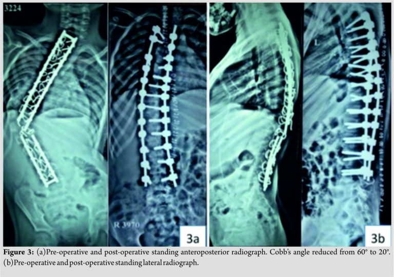 These templates were manufactured using polyurethane material.Hence, they could be sterilized and used intraoperatively for creating the tract for appropriate placement of pedicle screws as bony landmarks for putting pedicle screws by free-hand technique were obscured. Placement of pedicle screws was assessed postoperatively on CT scan. (Fig. 3) illustrates the pre-operative and post-operative radiographs of a patient.