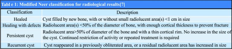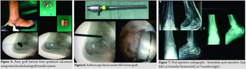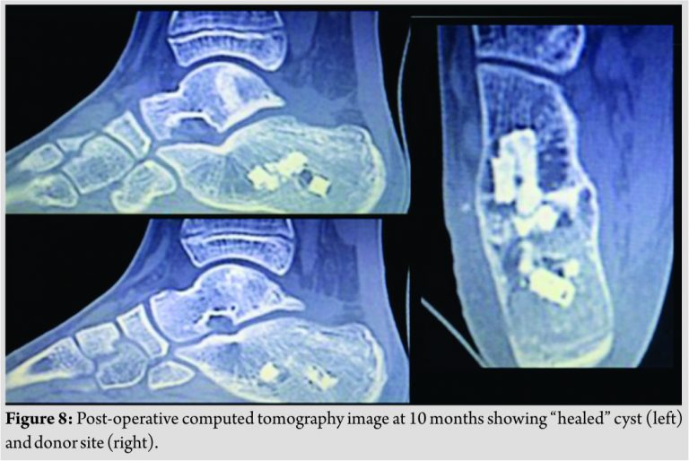 Conclusion: Outcome of the procedure was assessed clinically as well as radiologically. The histopathological report confirmed the lesion to be a SBC. The child was asymptomatic and resumed sports in school by 6months. The cystic lesion of talus healed completely by 8months. According to the modified Neer classification, the lesion had ‘healed’ radiologically.