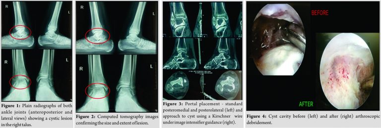 True cystic lesions of the talus are extremely rare. The differential diagnosis for a cystic lesion in the talus commonly includes aneurysmal bone cyst, SBC, intraosseous ganglion, osteochondral lesion, and chronic infections [1]. Most of the existing literature on talar cysts is related to osteochondral lesions [2,3,4]. In addition, the treatment of SBCs by both open and endoscopic methods has been described for long bone lesions with very little literature on talar lesions [5,6,7]. Jaffe and Lichtenstein, in 1942, were the first to use the term “solitary unicameral bone cyst.” They presented a concise and clear description of the radiologic and pathologic features of these lesions and classified them into “active” and “latent” cysts. Active cyst resulted from aberrant growth plate function. The cyst abutted the growth plate and had the potential to increase in size with progressive thinning of the cortices. Latent cyst had normal growth plate function. The cyst was separated from the growth plate by normal bone. Treatment was more likely to be simpler in such cases [5]. SBCs (or unicameral bone cysts) are primary bone tumors with maximum incidence in the first two decades. They account for 3% of all primary bone tumors in this age group [8]. The lesion has a male preponderance (2:1) [9]. The most commonly involved bones are proximal humerus and femur, accounting for around 94% of the cases. Calcaneum (2%), tibia and fibula (2%), and pelvis are the other bones involved [9]. Talar cysts account for only <0.001% of all cases of unicameral bone cysts [8]. A meta-analysis of 62 articles with a cumulative sample size of 3211 patients with 3217 SBCs summarized the management of SBC’s in general. Injection of methylprednisolone acetate (MPA) alone into the lesion resulted in a healing rate of 77.4%. Instillation of bone marrow aspirate into the lesion provided marginally better results at 77.9% [9]. Concentrated bone marrow may have greater healing potential than unconcentrated bone marrow [10]. However, significantly better outcome was observed when the inner wall was disrupted followed by MPA injection. The healing rate after curettage and bone grafting was 90%, irrespective of whether allograft or autograft was used. Conservative treatment with no active intervention indicated a healing rate of just 64.2% [9]. Open surgical techniques require osteotomy of the medial malleolus to access talar lesions. Very often, the cartilaginous roof of the cyst may be irreversibly damaged while performing proper curettage and bone grafting. Reconstruction of cartilaginous articular surface is difficult, if not impossible. Intralesional arthroscopy provides good visualization of these lesions without malleolar osteotomy or jeopardizing the articular cartilage [11]. A series of eight cases treated by arthroscopic curettage and bone grafting for large talar dome cysts of different etiologies reported significantly good results with no recurrence or complications during the follow-up period of upto2 years. However, none of these patients were diagnosed to have a SBC. Nevertheless, the author recommended arthroscopic curettage for cystic talar lesions >10mm in size [1]. Talar lesions in the posterior half of the body can be effectively tackled by posterior ankle arthroscopy. However, this approach may be difficult to access anteriortalar body cysts and also lead to excessive bone removal before reaching the anterior cyst. Various osseous portals at the talar neck (extrachondral), the talar dome (chondral), and talar facets (chondral) have been described for the anterior talar cysts [12]. Some talar cystic lesions have been attributed to trauma, most commonly the inversion type of ankle injuries. Initial radiographs in such cases were negative, but changes were reported at about 6 months post-injury. Furthermore, bone grafting might not be necessary for these cases [13]. Arthroscopic curettage for simple calcaneal cysts has been described and compared with open surgical procedure. Although the radiological healing was reported to be statistically insignificant, the overall success rate of the arthroscopic procedure was deemed to be better, considering the fewer complications in that group [14]. The radiological classification based on cyst healing was according to the modified Neer classification system [7]. In another series of six cases, there was associated flexor hallucis longus tendinitis in all cases with large ostrigoni in five of them. All cases were treated by curettage and bone grafting of the cysts arthroscopically. There was an improvement in median AOFAS score in all cases [15].
