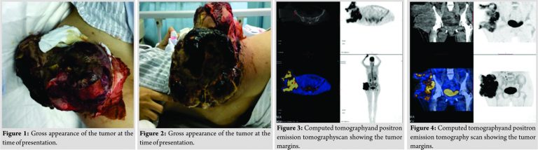 A 44-year-old Asian female presented with an extremely aggressive intramuscular, tender upper right thigh mass of 350mm × 250mm which had progressed over a 6-month duration without any antecedent of infection or trauma. The patient mentioned the size of the tumor was non-remarkable in the first 2 months when she first discovered it in October 2017 but progressed rapidly despite using traditional Chinese medicine and moxibustion. The lesion at the time it was presented to our department on March 2018 had a fungating skin appearance and ST involvement (Fig. 1 and Fig. 2) with a foul-smelling odor. The patient before presentation had used traditional Chinese herbal medicine and moxibustion to treat the tumor, but there was no remarkable improvement after 4 months of treatment. Apart from a previously treated mild thalassemia, there was no other significant preexisting medical history or any known allergies. On examination, the tumor appeared to be tender and soft to touch. Computed tomography and positron emission tomographyscans showed a well-demarcated tumor margin with no bone involvement confined to the tensor fasciae latae muscle (Fig. 3and Fig. 4). After all standard pre-operativeevaluation and preparation, the tumor was successfully resected (Fig. 5 and Fig. 6), followed by additional post-operative medical treatments of pain management, infection prevention, diet modifications, and other conventional rehabilitation procedures.