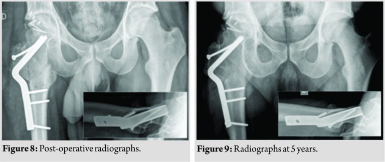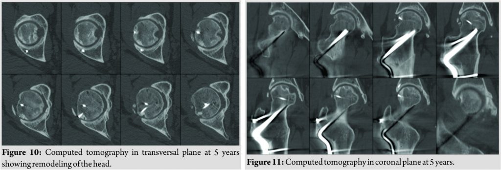 After head reduction, the intertrochanteric osteotomy was stabilized with a 120° blade plate (Depuy Synthes; 4528 Zuchwil Switzerland) and the trochanteric osteotomy with additional 4.5 mm lag screws (Fig. 8). For the first 3 post-operative months, the patient was mobilized on crutches with partial weight-bearing and active assisted mobilization of the hip in a lateral position under supervision by a physiotherapist. Radiographically, all osteotomies and fractures had united at 3 months, and the patient progressively started full weight-bearing and normal daily activities. At 5 months he was back to initial work as a truck driver. Asymptomatic, heterotopic ossification around the femoral head (Brooker Grade I) was seen. All his daily and recreational activities (Ski and Squash) could be restarted without any limitations. Satisfaction with the treatment was reported from the patient since the beginning. The hip mobility became a normal range after 6 months. At his most recent follow-up visit, 5 years after injury, the patient was very satisfied and completely asymptomatic. He had a symmetric range of motion of his hips and no limitations in daily and recreational activities. Radiographs demonstrated union of all osteotomies; osseous integration and remodeling of the bone graft as well as correct congruity and containment of the hip joint, without signs of osteoarthritis (Fig. 9, 10, 11). He was able to work 100% in his original profession. The Harris hip score was 98 points.