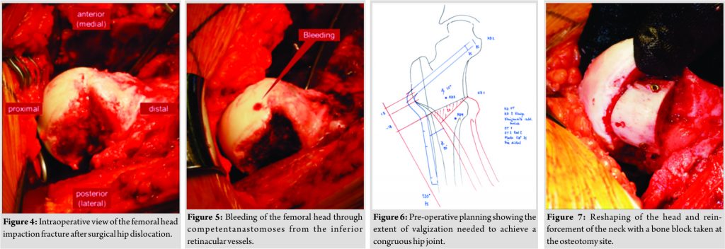 Conclusion: The intertrochanteric osteotomy aims to turn the impacted zone out of the weight-bearing area. Bone grafting of the defect helps to restore congruence and containment of the hip and additionally reinforces the femoral neck. To manage all the lesions present, a trochanteric flip approach with surgical hip dislocation is mandatory.